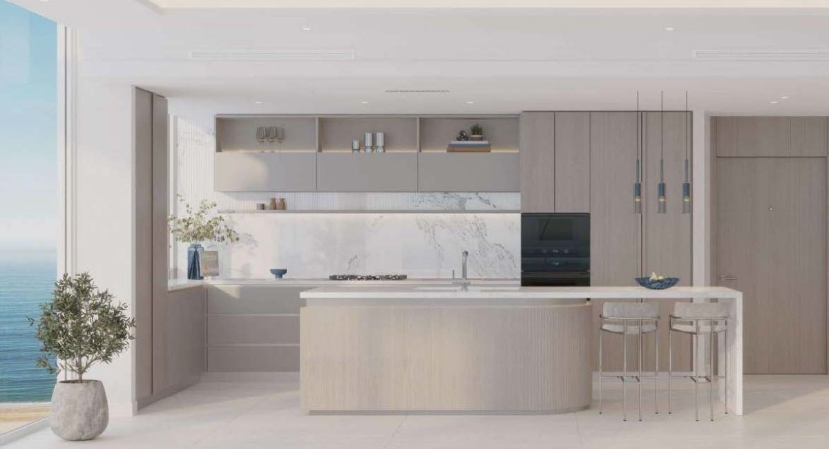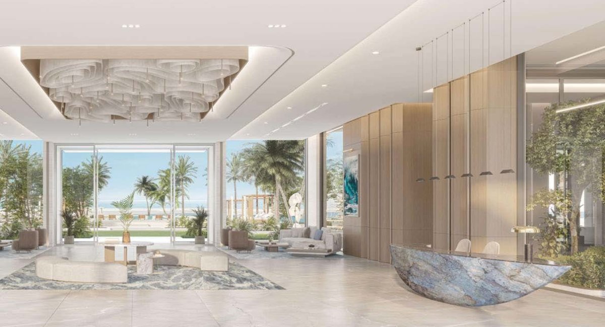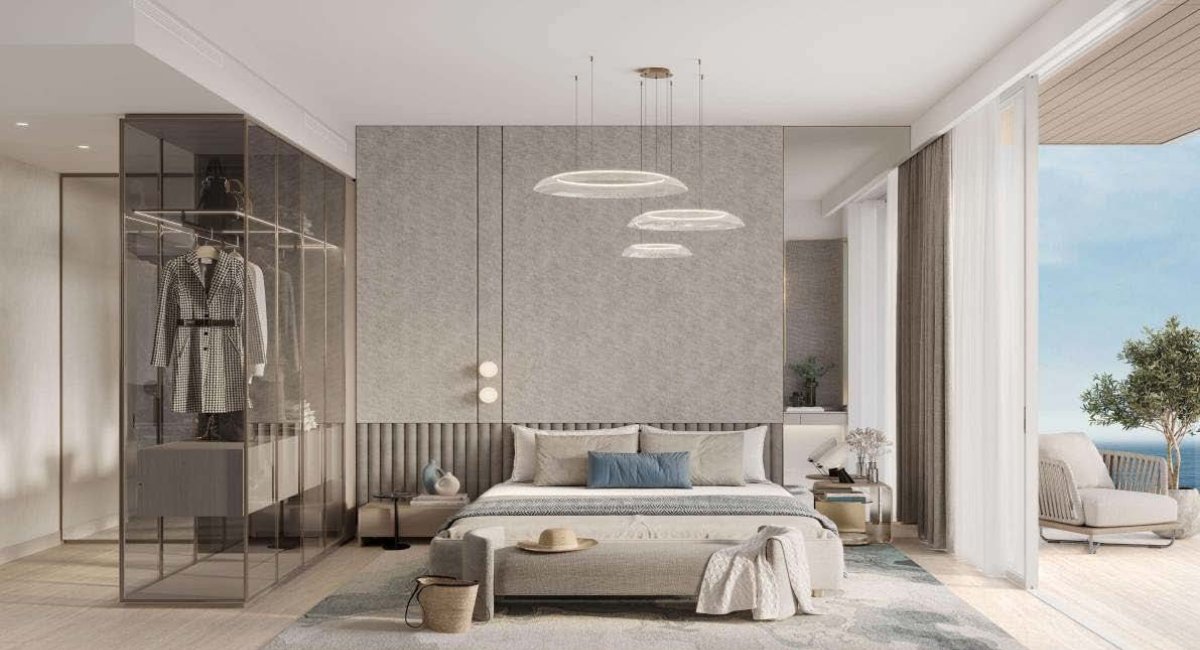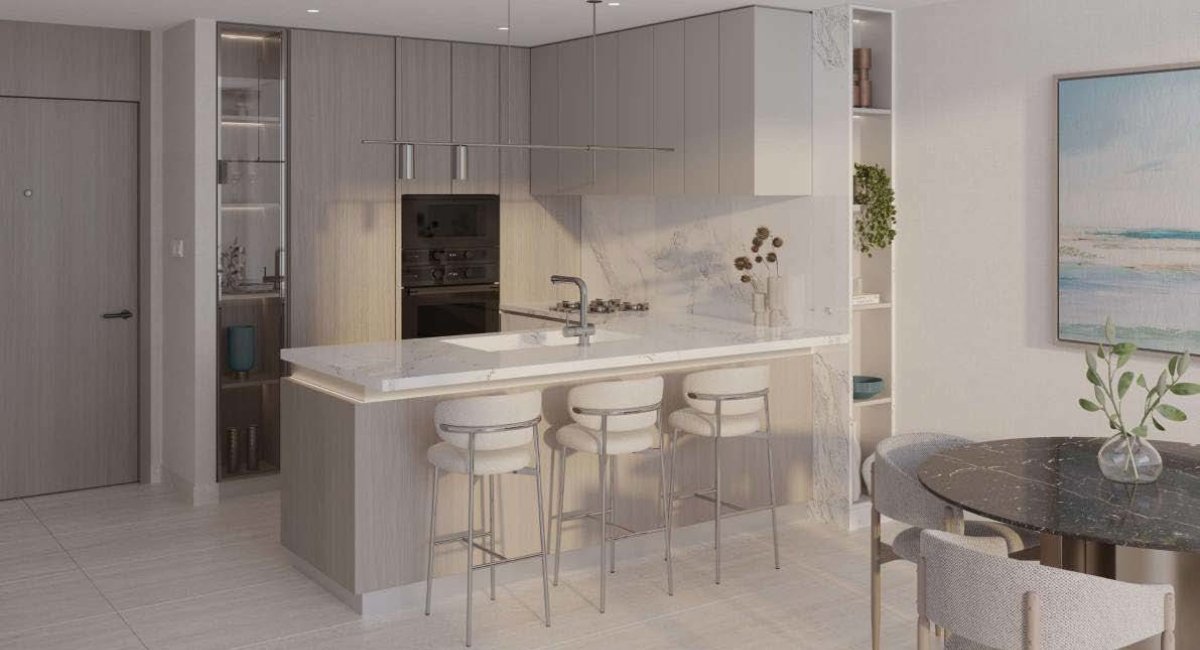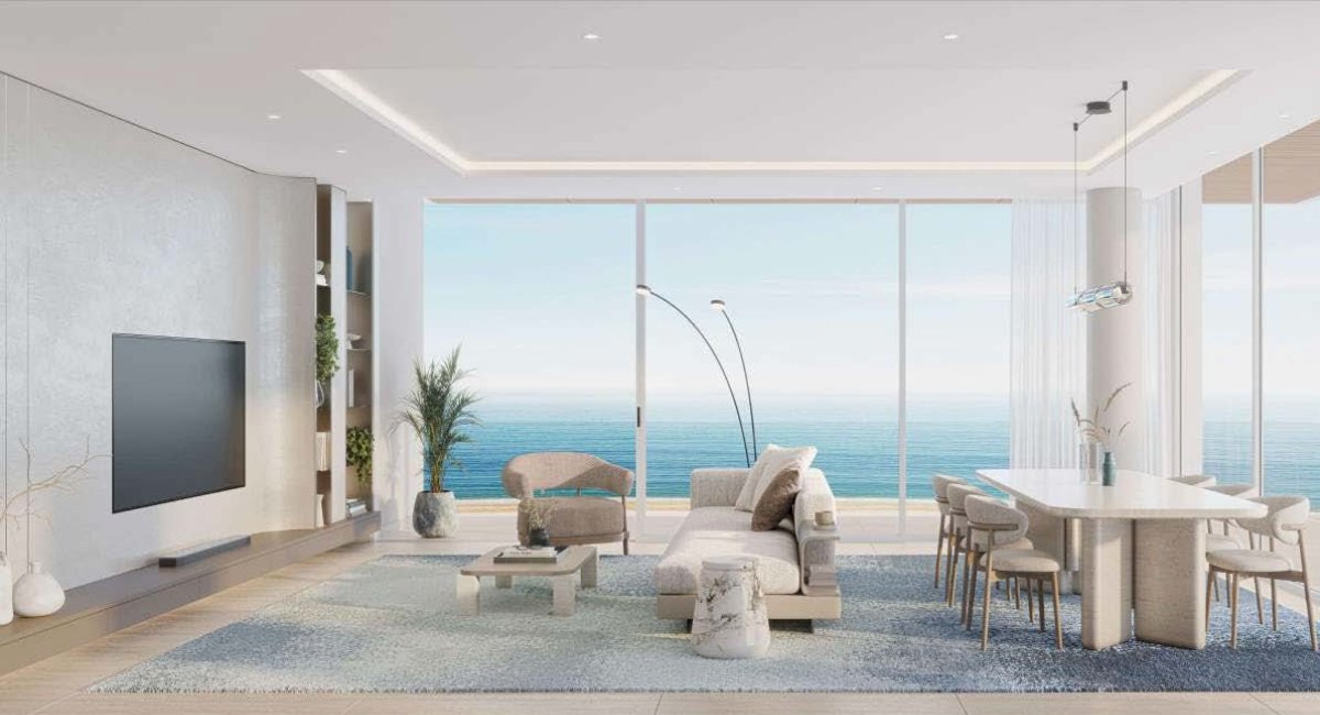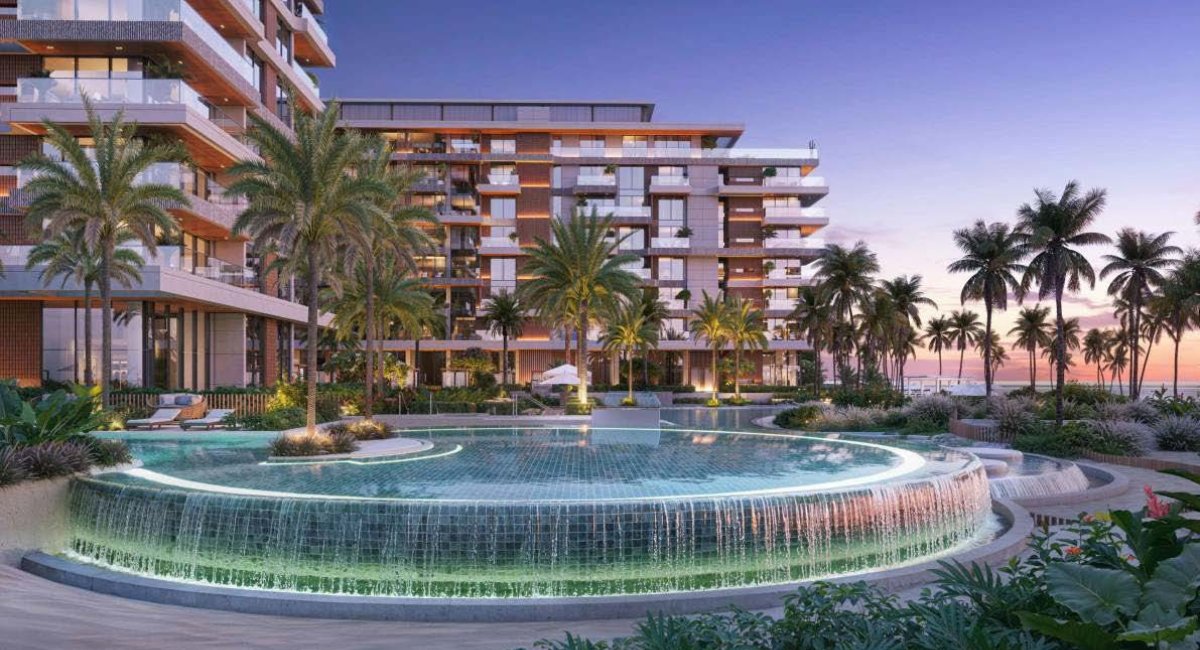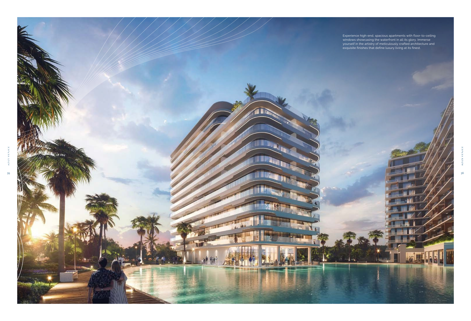 The development offers studios, 1, 2, and 3-bedroom apartments with modern layouts and waterfront views.